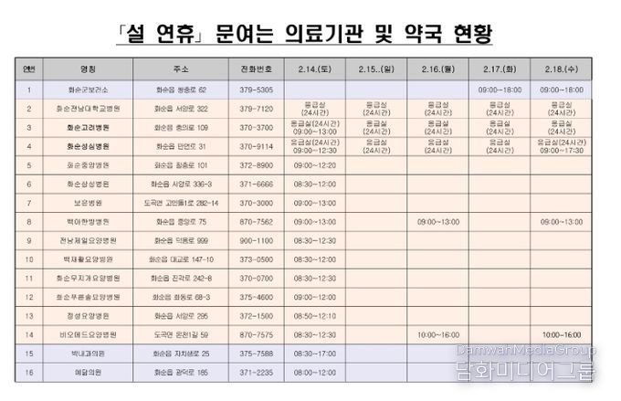 군은 설 연휴 기간에 지역응급의료센터인 화순전남대학교병원을 비롯해 병원 13개소, 의원 50개소, 보건소 1개소, 약국 24개소를 문 여는 의료기관 및 약국으로 지정·운영해 응급환자 발생에 대비하고 진료 공백을 최소화할 계획이다.