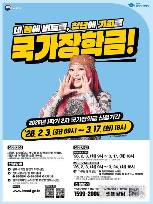 한편, 국가장학금을 지원받기 위해서는 반드시 신청 기간 내 국가장학금을 신청해야 한다. 현재 2026년 1학기 국가장학금 2차(최종) 통합 신청 기간이므로, 아직 신청하지 않은 학생은 신청 기간(2월 3일(화) ~3월 17일(화) 18시) 내 한국장학재단 누리집과 이동통신 앱(‘한국장학재단’)을 통해 신청해야 한다.