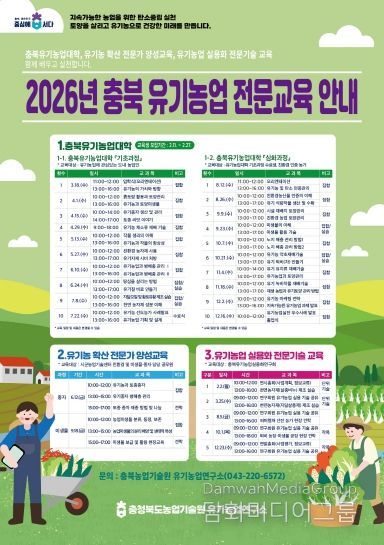 시민행정신문 강갑수 기자 | 충북농업기술원은 유기농업 전문인력양성을 위해 ‘2026년 충북유기농업대학’ 교육생을 2월 11일부터 27일까지 모집한다. 모집 대상은 충북 지역에 거주하며 유기농업 실천을 희망하는 농업인으로, 기초과정과 심화과정에서 각각 50명을 선발할 계획이다.