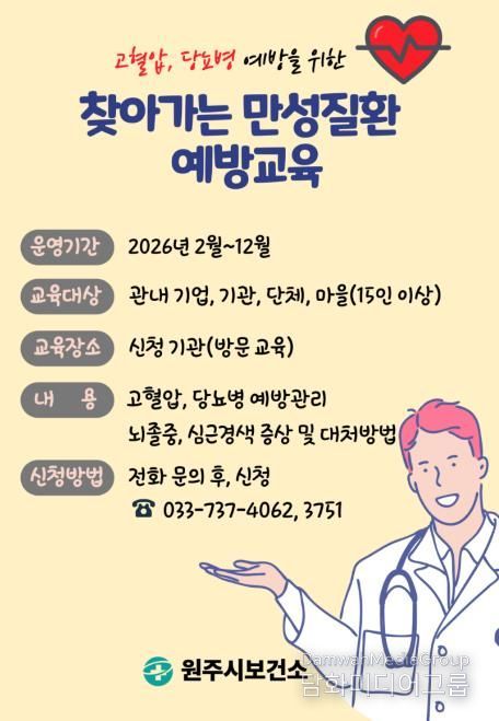 시민행정신문 기자 | 원주시보건소는 2월부터 12월까지 지역 주민을 대상으로 고혈압·당뇨병 등 만성질환 예방교육을 운영한다.