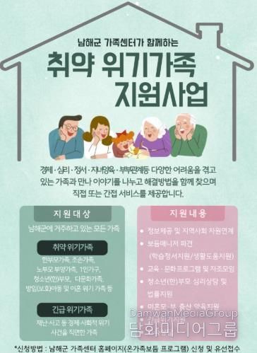 시민행정신문 강갑수 기자 | 남해군 가족센터는 위기 상황에 처한 가정과 다양한 형태의 가족을 지원하기 위해 2026년 ‘취약·위기가족지원사업(온가족보듬사업)’을 추진한다고 밝혔다.