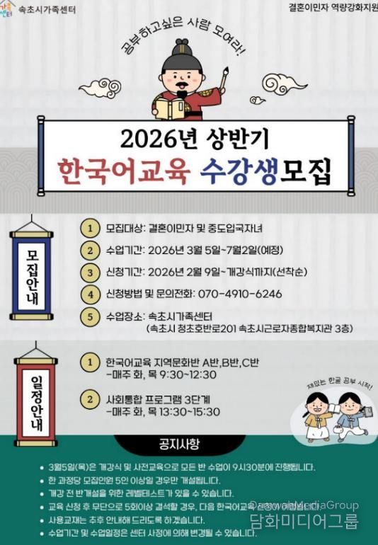 시민행정신문 강갑수 기자 | 속초시가족센터가 속초시에 거주하는 결혼이민자의 지역사회 정착과 자립을 돕기 위해 상반기 한국어 교육과 운전면허 취득 지원사업 참여자를 모집한다.