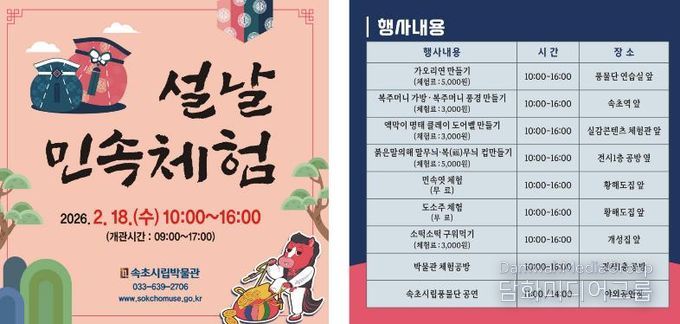 정종천 박물관장은 “설 명절을 맞아 시민과 관광객이 함께 전통문화를 체험하며 따뜻한 명절 추억을 만들 수 있도록 이번 행사를 마련했다”며 “앞으로도 속초시립박물관이 지역의 역사와 문화를 공유하는 열린 문화공간으로 자리매김할 수 있도록 다양한 프로그램을 지속적으로 추진하겠다”고 말했다.