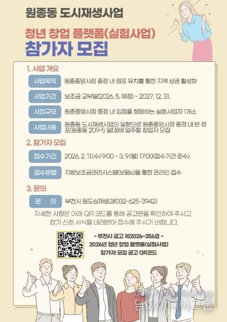 박희정 부천시 원도심재생과장은 “청년 창업 플랫폼은 도시재생을 통해 청년의 아이디어가 실험에 그치지 않고 지역과 함께 성장하도록 연결하는 사업”이라며 “창의적인 아이디어를 가진 청년들의 많은 관심과 참여를 기대한다”고 말했다.