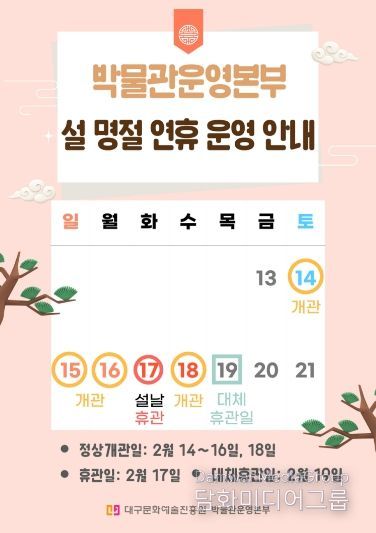 한편, 대구시립 3개 박물관은 설 연휴 다음날인 2월 19일(대체휴관일)에는 하루 쉰다.