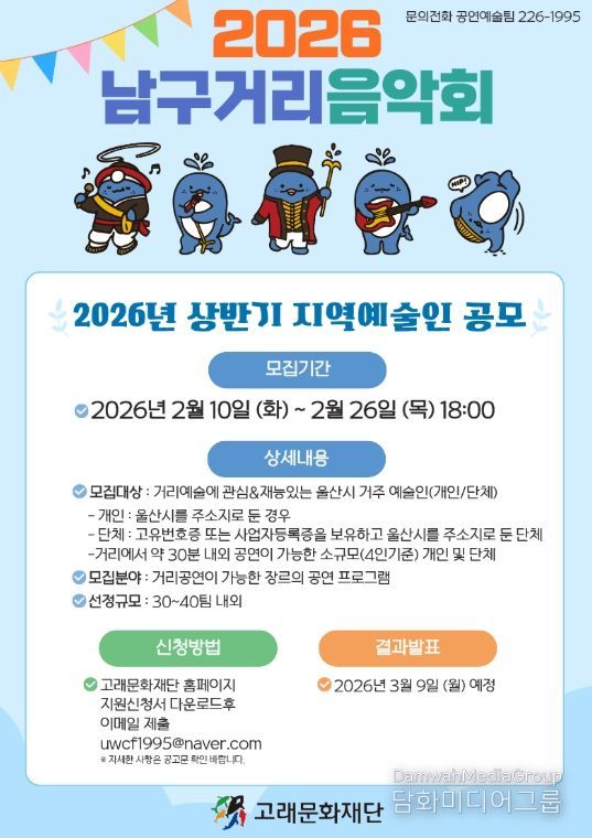 시민행정신문 강갑수 기자 | (재)고래문화재단은 지역 예술인의 활동 무대를 넓히고 시민들이 일상 속에서 자연스럽게 문화를 즐길 수 있도록 ‘2026년 남구 거리음악회 지역예술인 지원사업’상반기 공모를 실시한다.