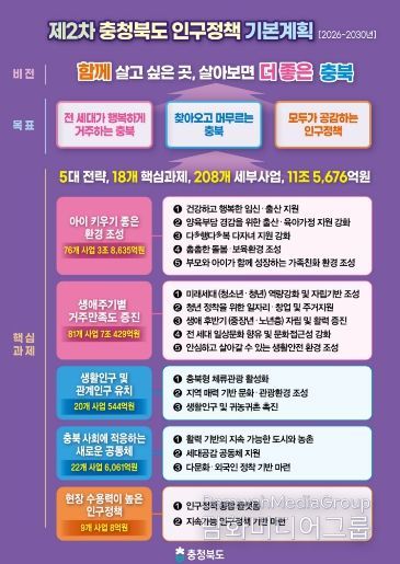 “함께 살고 싶은 곳, 살아보면 더 좋은 충북”을 비전으로, ‣전 세대가 행복하게 거주하는 충북 ‣찾아오고 머무르는 충북 ‣모두가 공감하는 인구정책을 목표로 한다. 이를 위해 5대 전략, 18대 핵심과제, 208개 세부사업을 추진하며, 2030년까지 총 11조 5,676억원을 투입할 예정이다. 이는 1차 기본계획 대비 1조7,536억원이 증액된 규모다.