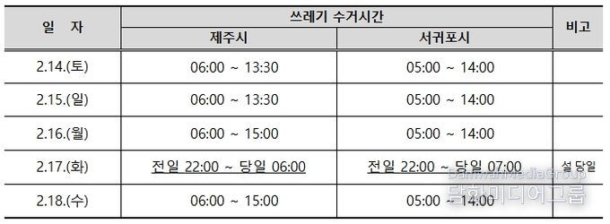 임홍철 제주도 기후환경국장은 “설 연휴에도 쓰레기 처리와 관련한 불편을 최소화하고 깨끗한 환경을 유지하기 위해 최선을 다하겠다”며 “쓰레기 줄이기와 올바른 분리배출 등 도민 여러분의 적극적인 협조를 당부드린다”고 밝혔다.