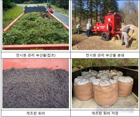 연구진은 전시원에서 주로 제거되는 개망초, 쇠뜨기, 달맞이꽃, 쑥 등 잡초 4종과 참나무 낙엽을 3:1 비율로 혼합해 퇴비를 제조했다. 발효 과정에서는 혼합 후 3일 만에 온도가 약 45~51℃까지 상승하며 미생물 분해가 활발히 진행됐고, 약 50일 이후 안정화 단계를 거쳐 총 90일 만에 천연 퇴비가 완성됐다.
