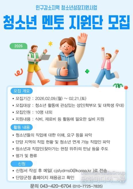 시민행정신문 강갑수 기자 | 단양군청소년수련관은 인구감소지역 청소년성장지원사업의 일환으로, 청소년의 건강한 성장과 진로 탐색을 지원하기 위한 ‘청소년멘토지원단’을 모집한다고 밝혔다.