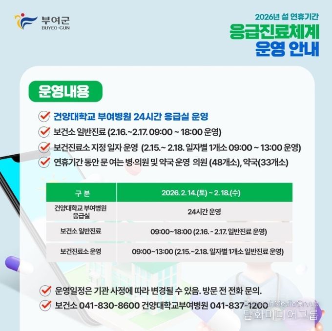 연휴 기간에는 지역응급의료기관인 건양대학교부여병원 응급실이 24시간 운영되며, 관내 병의원 48개소와 약국 33개소를 ‘문 여는 병의원 및 약국’으로 지정·운영하여 진료 공백을 최소화할 계획이다.