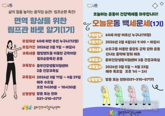 시민행정신문 기자 | 시흥시보건소 중부건강생활지원센터에서는 일상 속 움직임이 쌓여 내일의 건강한 삶으로 이어질 수 있도록, 지역주민 대상 신체활동 프로그램 ‘오늘 운동 백세 운세’와 ‘면역 향상을 위한 림프관 바로 알기’를 운영한다.