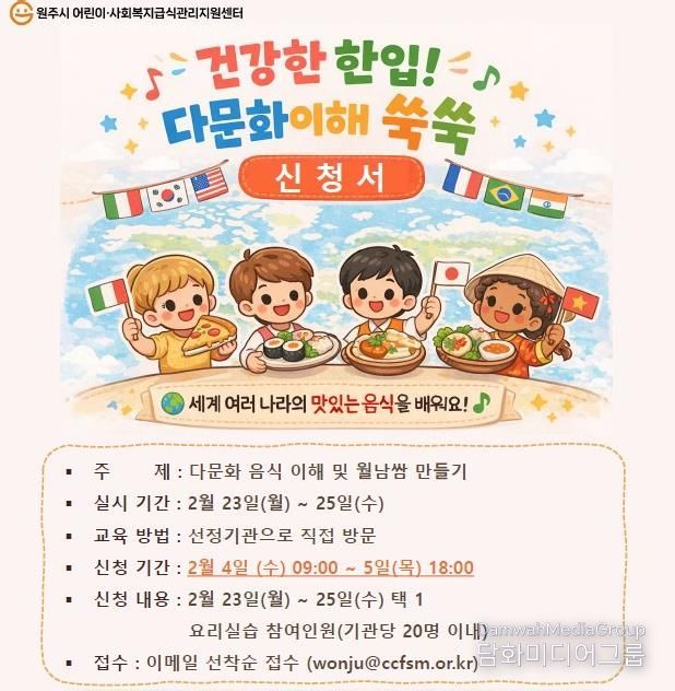 시민행정신문 강갑수 기자 | 원주시어린이·사회복지급식관리지원센터는 오는 23일부터 25일까지 3일간 특화사업인 ‘쑥쑥 요리교실’을 운영한다.