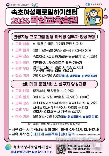 시민행정신문 이세훈 기자 | 속초여성새로일하기센터가 취업을 준비하는 여성의 직업 역량 강화와 취업 연계를 위해 2026년 직업교육훈련 교육생을 모집한다.