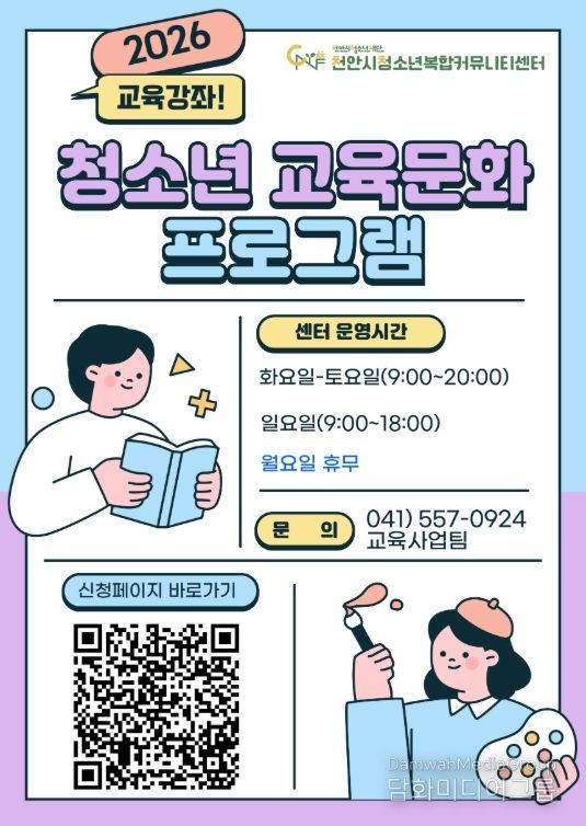 시민행정신문 강갑수 기자 | (재)천안시청소년재단 천안시청소년복합커뮤니티센터가 내달부터 운영되는 ‘2026년 새 학기 교육문화 프로그램’ 수강생을 모집한다고 12일 밝혔다.
