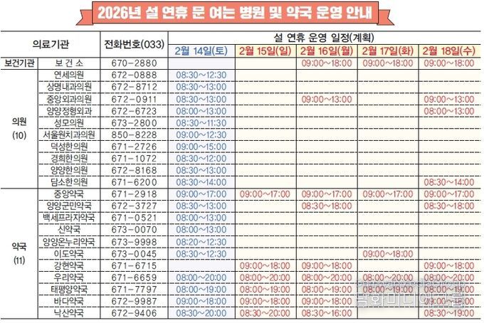 시민행정신문 기자 | 양양군은 설 연휴 귀성객과 관광객 증가에 대비해 2월 14일부터 18일까지 ‘설 연휴 종합대책상황실’을 운영하고, 재난·교통·보건·환경․물가 등 민생 전반을 아우르는 설 연휴 종합대책을 추진한다.