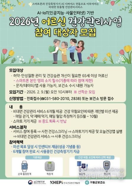 참여 대상자는 65세 이상 어르신으로, 9일부터 오는 3월 13일까지 120명을 선착순 모집하고 있다. 신청은 가평군보건소 1층 심뇌혈관질환실 방문 또는 전화(031-580-2010, 2838)로 가능하다. 사업 기간은 5월부터 10월까지 약 6개월이다.
