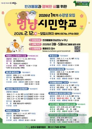 시민행정신문 김학영 기자 | 순천시는 오는 3월부터 반려동물과 반려인을 대상으로 한 시민 교육프로그램인 ‘멍냥시민학교’를 운영한다고 밝혔다.