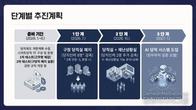 시는 올해 상반기를 사전 준비 기간으로 정하고, 8개 부서가 참여하는 AI 당직 전담조직(TF)을 구성하고 시·구청 당직 통합 시 근무량을 검증했다. 다음 달에는 구청 당직 폐지 시 예상되는 시민 불편과 사각지대를 시뮬레이션 방식으로 점검하고, 5월까지 조례·규칙 개정과 법제 심사를 마쳐 제도적 기반을 마련할 예정이다.