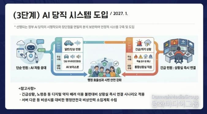 내년 1월부터는 3단계 ‘AI 당직 시스템’을 본격 가동한다. 야간시간 처리가 불가능한 단순 부서 이관 민원 등은 AI 보이스봇이 24시간 자동 접수하고, 긴급 상황·복합 민원은 즉시 통합상황실로 자동 연동되는 AI-인간(Human) 협업 방식이다. 노령층 등 디지털 약자를 위한 즉시 연결 서비스와 장애 대비 비상 인력 체계도 마련한다.
