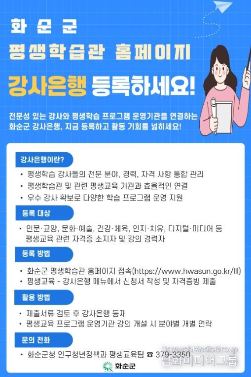 ‘강사은행’ 등록과 관련한 자세한 사항은 화순군청 인구청년정책과 평생교육팀으로 문의하면 된다.