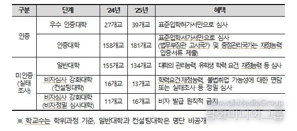 한편, 인증대학 외에 외국인 유학생이 1명 이상 재적 중인 대학에 대해서는 ‘유학생 유치‧관리 실태조사’를 실시하고, 일정 기준을 충족하지 못할 시 비자심사 강화대학(컨설팅대학, 비자정밀 심사대학)으로 지정했다. 이를 통해 대학이 외국인 유학생의 유치 단계에서 어학 능력과 재정 능력 등을 엄격히 심사하도록 하고, 유학생 관리 전반에 대한 대학의 책임을 강화할 예정이다.