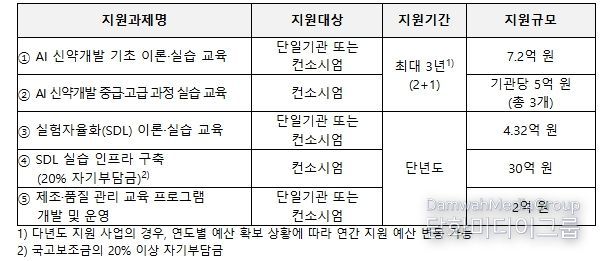 이번 공모를 통해 최대 7개 수행기관을 선정하며, 지원기간은 과제별로 구분하여 지원한다. 지원과제는 AI 신약개발 기초 이론·실습 교육, 중급·고급 과정 실습 교육, 실험자율화 이론·실습 교육, 실험자율화 실습 인프라 구축, 제조·품질 관리 교육까지 총 5개 단위이다.