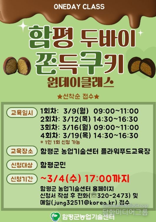 함평군 농업기술센터는 “내달 4일까지 ‘두바이 쫀득쿠키 만들기’ 원데이 클래스 교육생을 모집한다”고 13일 밝혔다.