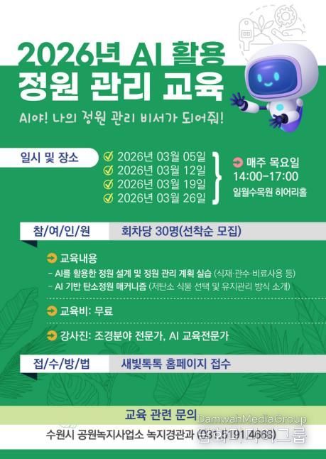 생성형 인공지능(AI) 교육 전문가와 조경·정원 분야 전문 강사진이 이론과 사례를 중심으로 강의한다. 수강을 원하는 시민은 수원시 시민참여 플랫폼 ‘새빛톡톡’에서 신청하면 된다. 선착순 모집이다.