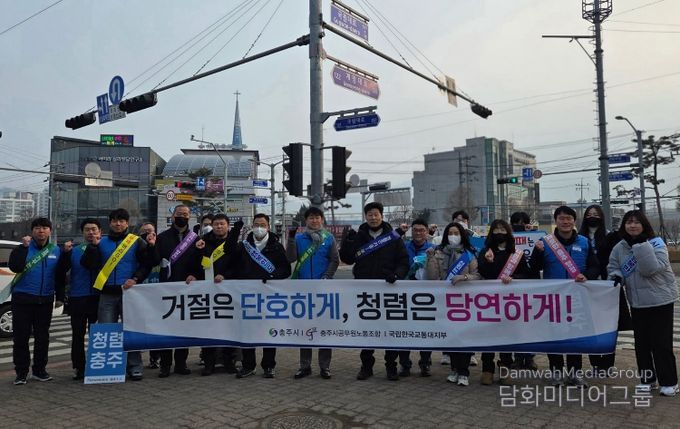 충주시는 13일 오전 8시 20분부터 교현동 법원사거리에서 충주시 감사담당관실과 충주시공무원노동조합 주관으로 ‘관내 공공기관 합동 청렴 캠페인’을 실시했다고 밝혔다.