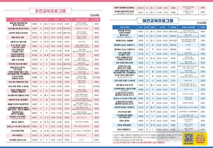 특히 이번 프로그램은 특정 분야에 편중되지 않도록 문화·취미·실생활 역량을 고르게 아우르는 균형있는 구성에 중점을 두었다. 기존 인기 강좌는 안정적으로 운영하는 한편, 다양한 신규 강좌를 함께 편성해 군민들의 선택 폭을 넓혔다.