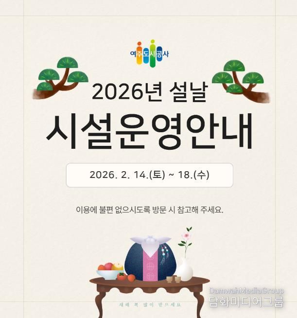 시민행정신문 강갑수 기자 | 여주도시공사가 다가오는 2026년 설 연휴를 맞아 시민과 귀성객들이 안전하고 편안한 명절을 보낼 수 있도록 주요 시설 운영시간 조정 및 특별 서비스를 시행한다고 밝혔다.