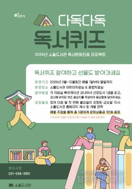 시민행정신문 강갑수 기자 | 포천시립소흘도서관은 독서 생활화와 지역사회 독서문화 확산을 위해 오는 3월부터 어린이, 청소년·일반을 대상으로 대상으로 ‘다독다독 독서퀴즈’를 운영한다.