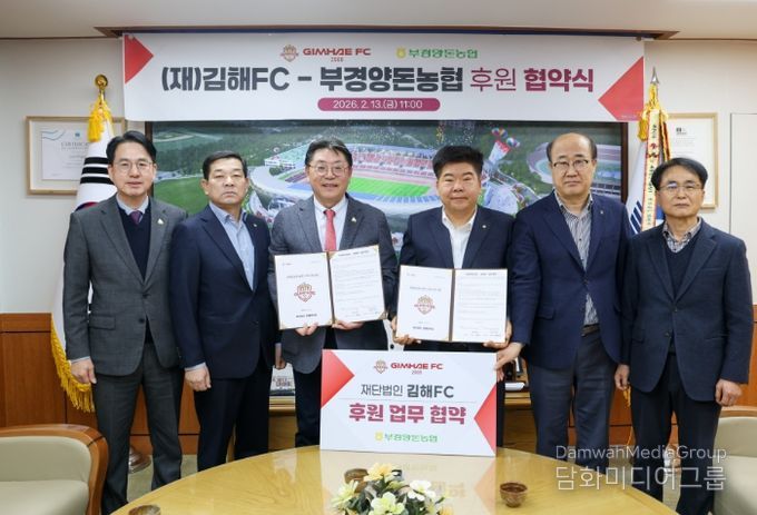 시민행정신문 강갑수 기자 | 재단법인 김해FC가 부경양돈농협과 공식 후원 협약을 체결하며 2026시즌의 힘찬 출발을 알렸다. 협약식은 13일 김해시청에서 구단주인 홍태용 김해시장과 부경양돈농협 이재식 조합장이 참석한 가운데 진행됐다.
