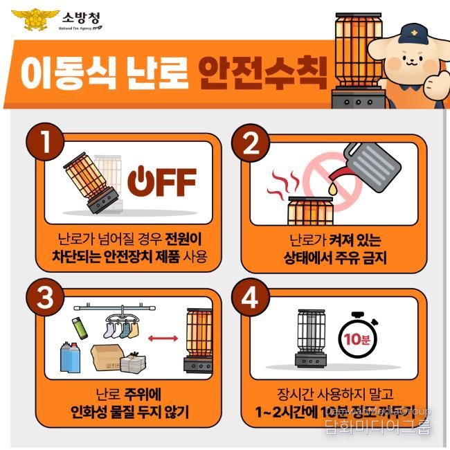 이에 따라 광명소방서는 이동식 난로 화재 예방을 위해 ▲전도 시 전원 차단 등 안전장치가 있는 제품 사용 ▲난로 작동 중 주유 금지 ▲난로 주변 인화성 물질 제거 ▲장시간 사용 시 주기적인 전원 차단 및 환기 등 안전수칙 준수를 당부했다.