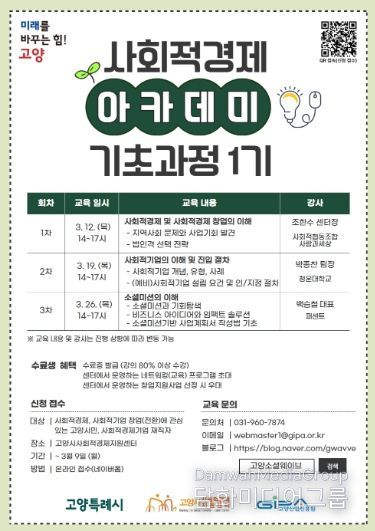 시민행정신문 이세훈 기자 | 고양산업진흥원 고양시사회적경제지원센터가 오는 3월 9일까지 ‘2026년 고양시 사회적경제 아카데미 기초과정 1기’수강생을 모집한다.