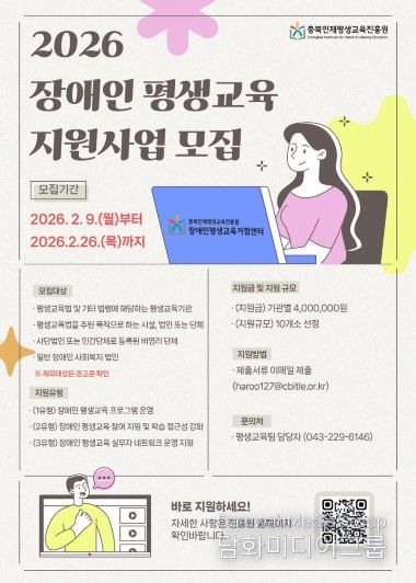 시민행정신문 강갑수 기자 | 충북인재평생교육진흥원(원장 유태종)은 2026년 장애인 평생교육 지원사업에 참여할 도내 기관·단체를 공개 모집한다.