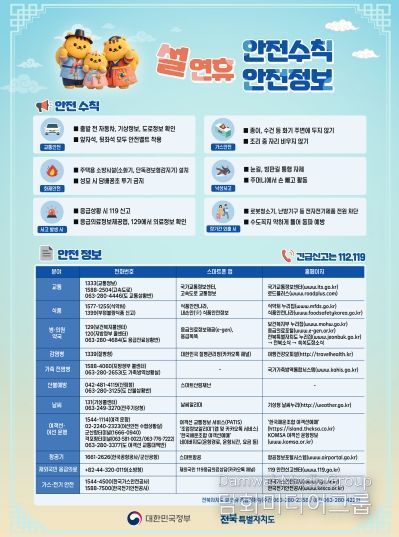 노홍석 전북자치도 행정부지사는 “24시간 빈틈없는 상황관리로 도민 모두가 안심하고 설 명절을 보낼 수 있도록 총력을 다하겠다”며 “일상 속 안전수칙 준수와 안전문화 확산에 도민들의 자발적인 참여를 부탁드린다”고 말했다.