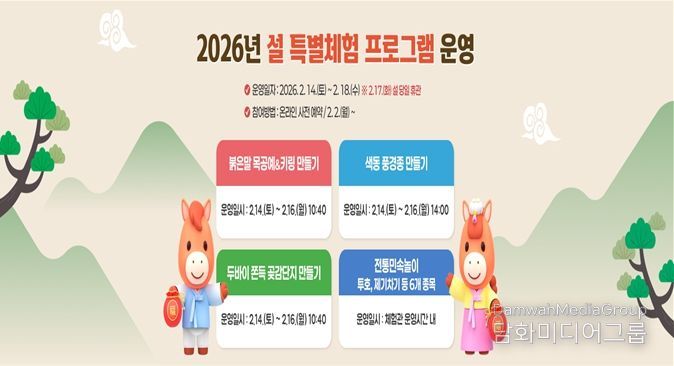 이번 특별체험 프로그램은 사전예약 접수 방식으로 진행되며 △붉은말 목공예&키링 만들기 △색동풍경종 만들기 △설 복주머니 곶감단지 만들기 등 온 가족이 함께 참여할 수 있는 체험활동으로 구성됐다.