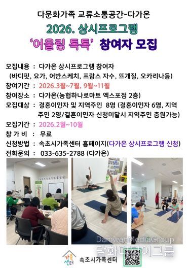 시민행정신문 강갑수 기자 | 속초시가족센터 다문화가족 교류·소통공간 ‘다가온’은 3월부터 11월까지 2026년 상시프로그램과 자조모임 활동을 운영하고, 결혼이민자와 취약계층을 위한 자격증 취득 지원사업을 함께 추진한다.