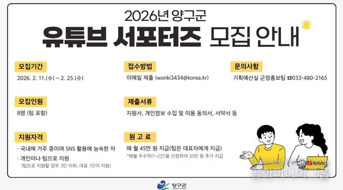 시민행정신문 강갑수 기자 | 양구군이 오는 25일까지 지역의 매력을 영상으로 생생하게 전달할 유튜브 서포터즈를 모집한다.