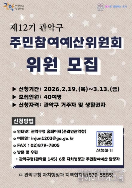 이에 따라 구는 주민참여예산제를 새롭게 이끌어갈 ‘제12기 관악구 주민참여예산위원회’ 위원을 오는 3월 13일까지 모집한다. 이번 제12기 위원회에서는 약 40명의 신규 위원을 선발할 계획이다.