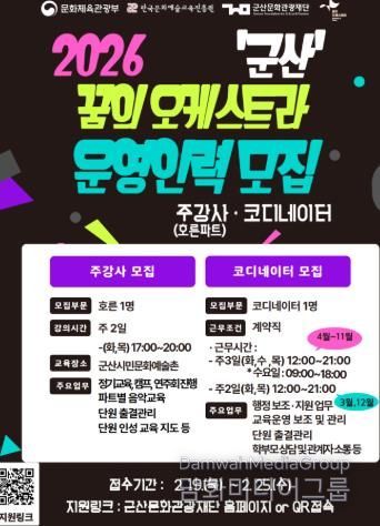 시민행정신문 강갑수 기자 | (재)군산문화관광재단이 ‘2026 꿈의 오케스트라 군산’의 안정적인 운영과 교육 프로그램의 질적 향상을 위해 운영인력(주강사․코디네이터)을 25일까지 공개 모집한다.