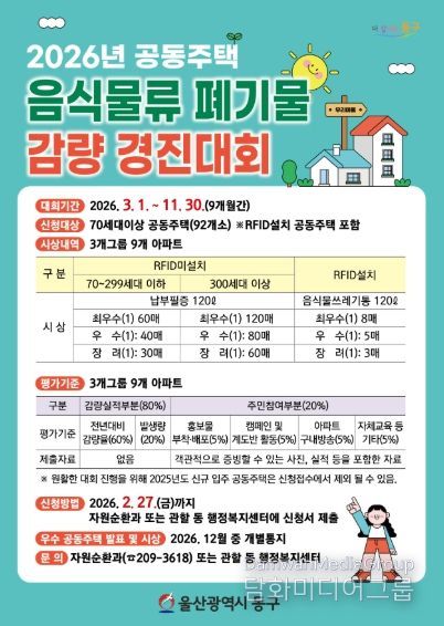 시민행정신문 강갑수 기자 | 울산 동구는 주민들의 음식물류 폐기물 감량에 대한 적극적 관심과 자발적 참여를 유도하기 위해 관내 70세대 이상 공동주택을 대상으로 ‘공동주택 음식물류 폐기물 감량 경진대회’를 실시한다고 밝혔다.