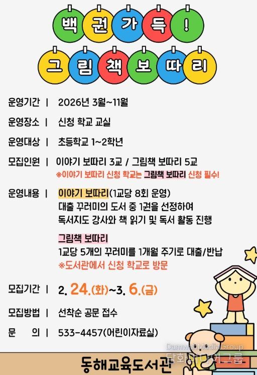동해교육도서관은 3월부터 11월까지 초등학생들이 독서에 흥미를 느끼고 평생 독자로 성장할 수 있는 기반을 마련하고자 ‘백 권 가득! 그림책 보따리’ 프로그램을 운영한다고 밝혔다.