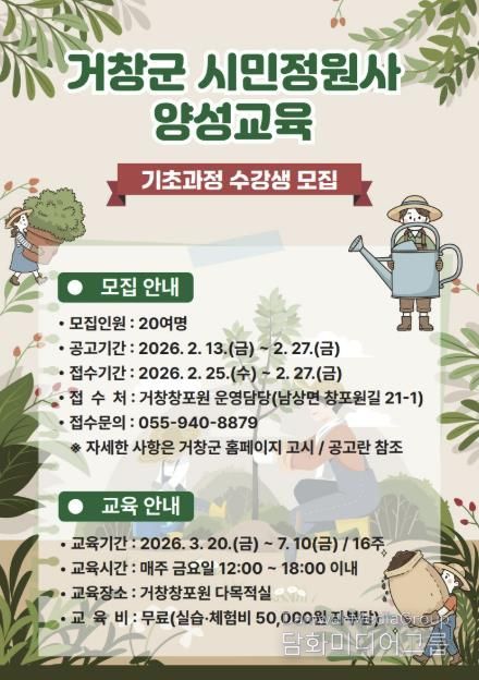 신동일 환경과장은 “시민정원사 양성교육을 통해 주민들의 정원 전문성을 높이고 지역 정원문화 확산에 기여하길 기대한다”며 “정원에 관심 있는 군민들의 많은 참여를 바란다”고 말했다.