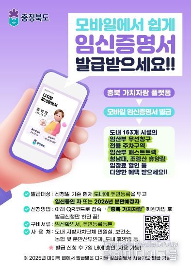 디지털 임신증명서는 2025년 민간 앱과 협업해 추진됐으나, 올해부터는 충청북도의 임신·출산·육아 종합 플랫폼인 ‘가치자람’에서 신청할 수 있도록 변경됐다. 신청 후에는 임신증명서를 이미지파일 형태로 내려받아 모바일 기기에서 손쉽게 활용할 수 있으며, 2025년 민간 앱에서 발급받았던 대상자도 동일하게 발급받을 수 있다.