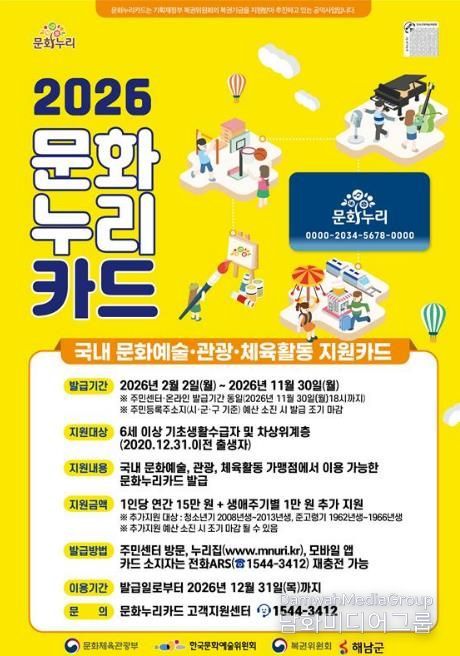 시민행정신문 강갑수 기자 | 해남군은 문화 소외계층의 문화 향유 기회를 넓히기 위해‘2026년도 통합문화이용권(문화누리카드) 사업’을 본격 추진한다.