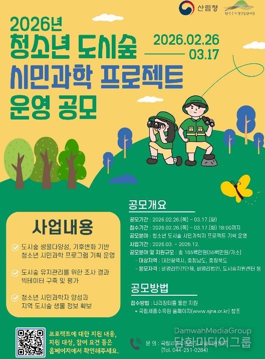 시민행정신문 김학영 기자 | 산림청은 녹색자금(복권기금)을 활용해 ‘2026년 청소년 도시숲 시민과학 프로젝트’를 본격 추진한다고 20일 밝혔다.