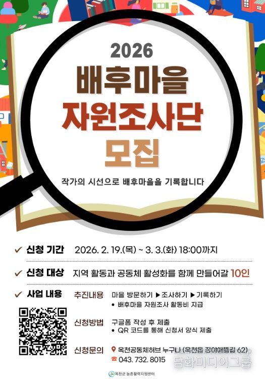 시민행정신문 강갑수 기자 | 옥천군이 2026년 시군역량강화사업의 일환으로 ‘2026년 배후마을 자원조사’에 참여할 마을과 조사단을 모집한다.